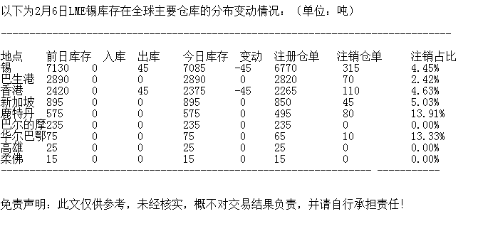 LME 2月6日锡库存分布情况